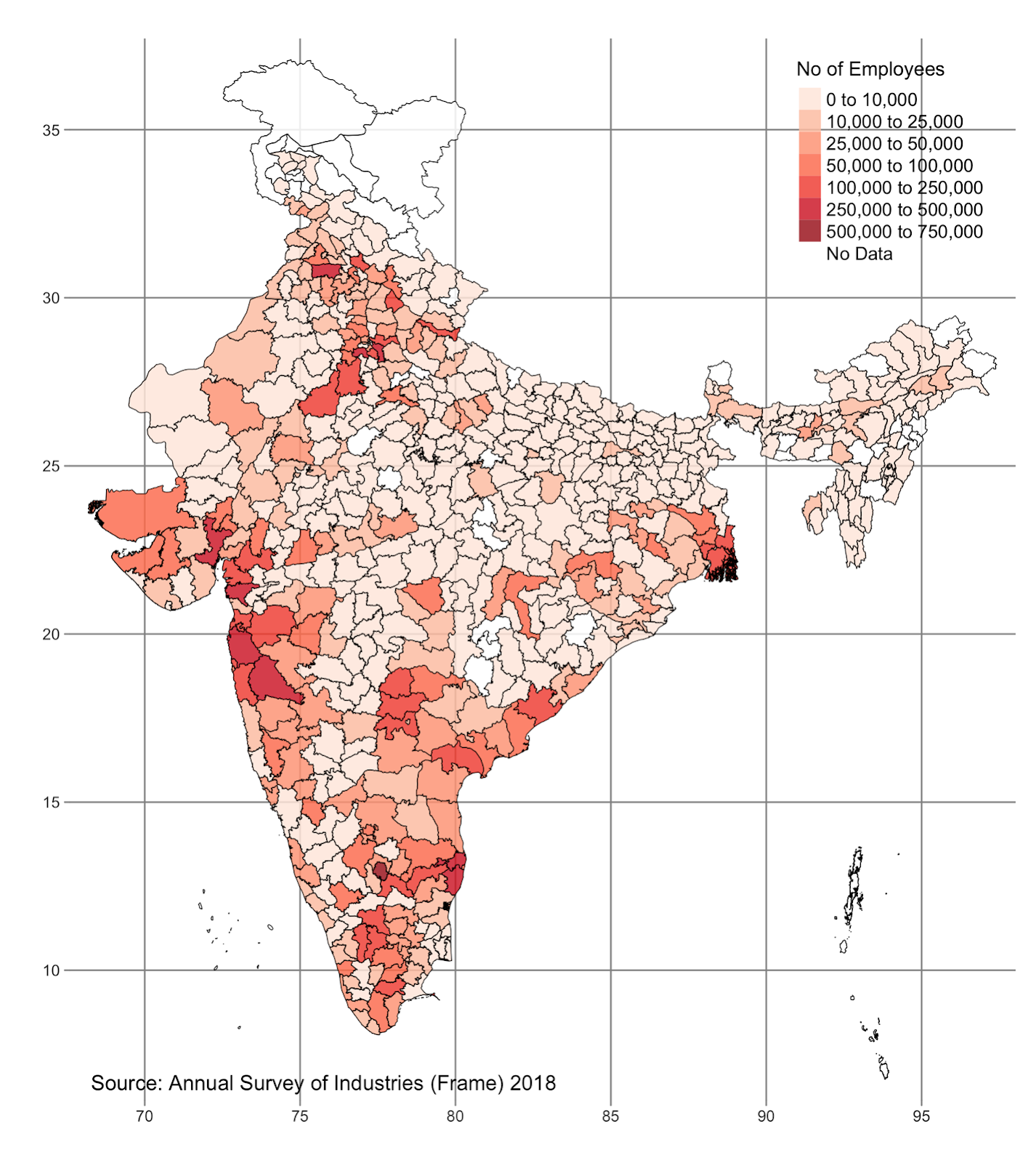 To get a better sense of where most manufacturing employment is located, we looked at both the Sixth Economic Census (EC) of 2013 and the Annual Survey of Industries (ASI) frame of 2018 (for a pictorial representation, see the figures at the end of this article). While the Economic Census captures all manufacturing firms – formal and informal — including tiny establishments, the ASI captures formal manufacturing plants that employ more than 10 workers. As per the ASI frame, Ahmedabad, Bengaluru, Gautam Buddha Nagar (Noida), Gurugram, Pune, Surat and Thane constitute 20% of all formal manufacturing jobs. Further, 50% of these are located in just 36 districts out of 600. Even when we expand the coverage to include informal manufacturing jobs – as covered by the EC and the PLFS – manufacturing jobs remain spatially concentrated in a few districts, see the adjoining table.