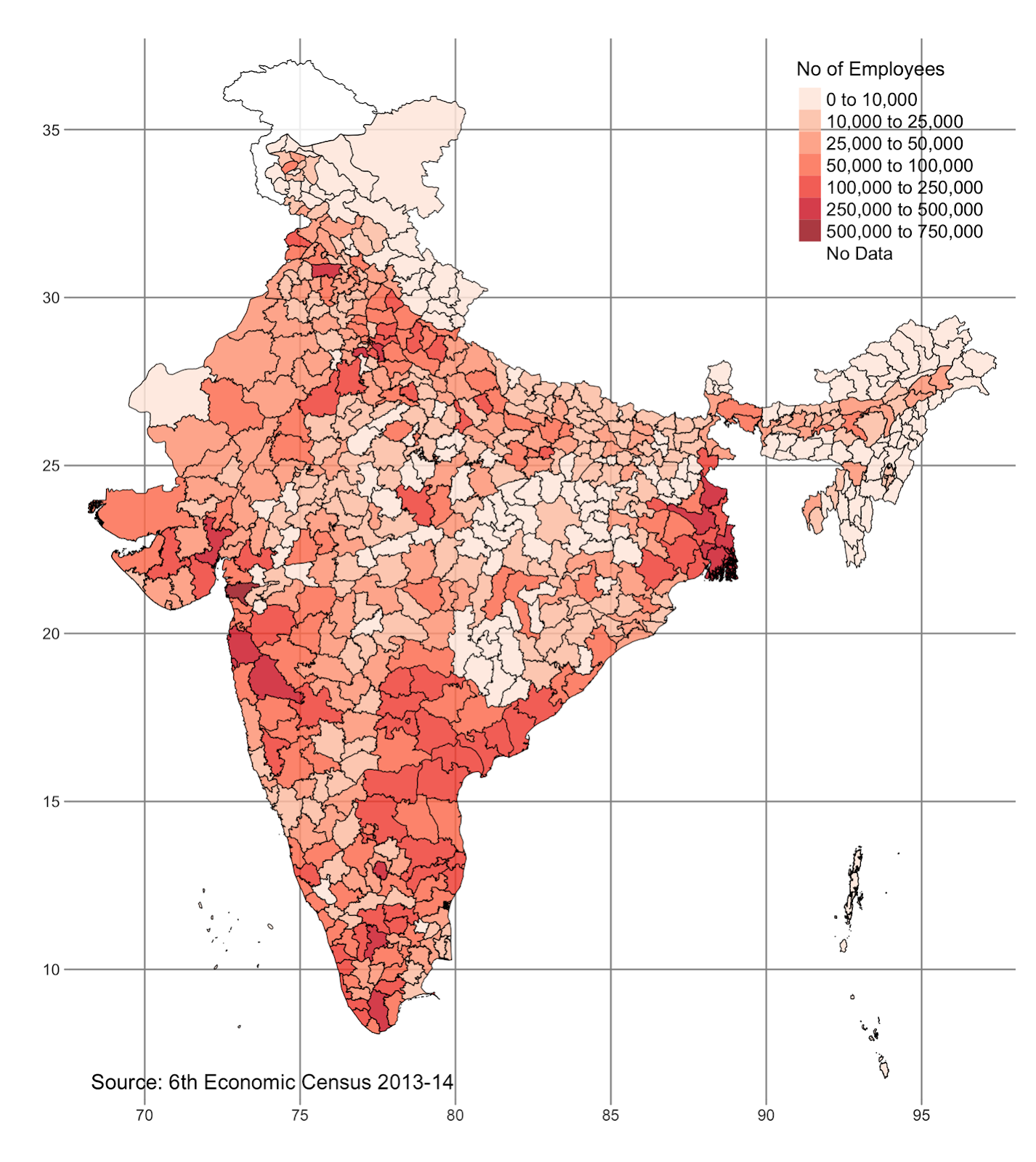 The two maps depict the spatial distribution of manufacturing jobs according to the ASI and EC. Broadly they paint a similar picture– in poet Khalilur Rahman Azmi’s words, ḳhalā hī ḳhalā (emptiness upon emptiness). The ASI map reveals that even in the states where formal manufacturing is supposed to be thriving, such as Maharashtra, Gujarat, Andhra Pradesh and Tamil Nadu, a granular look delineates a handful of regions which are the key drivers. In contrasting the two maps, the reader can also notice the EC one is somewhat denser than the ASI. This illustrates that most manufacturing firms in India stay very small, which leads to our next fact.