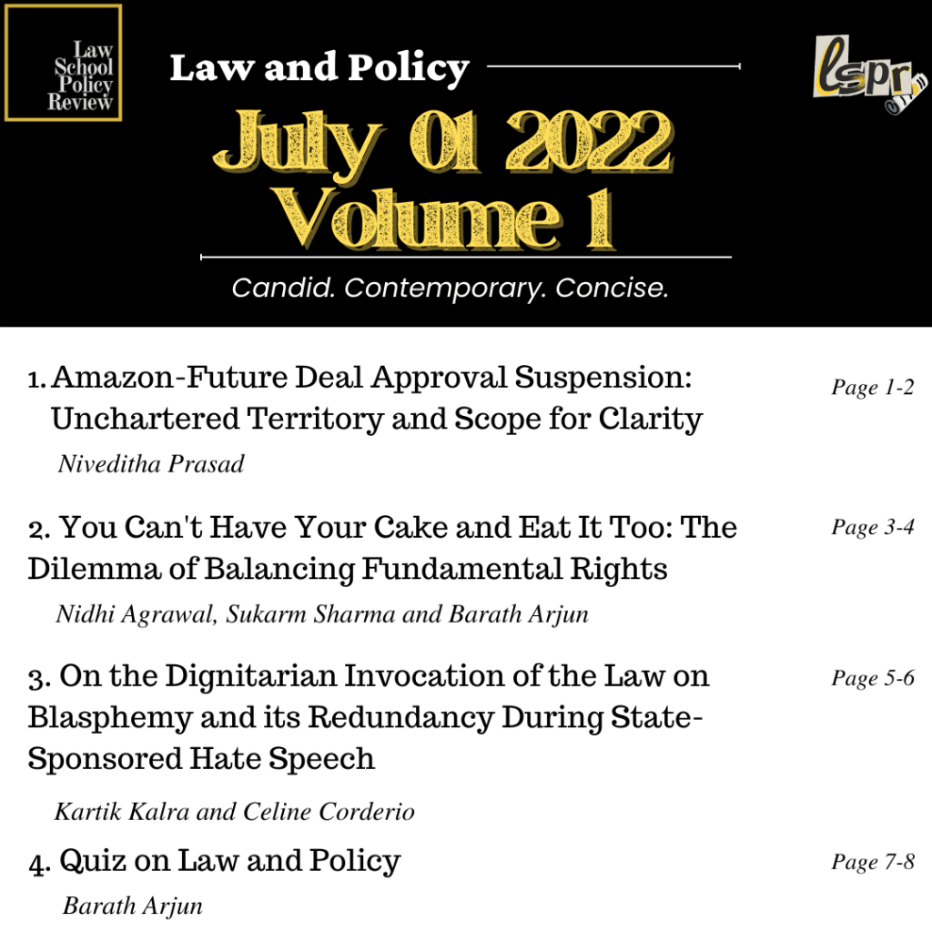The Law School Policy Review (LSPR) is excited to bring to you the First Volume of its bi-weekly newsletter. It will tackle contemporary developments in the realm of law and policy and seeks to bring updates in an accessible and concise form.