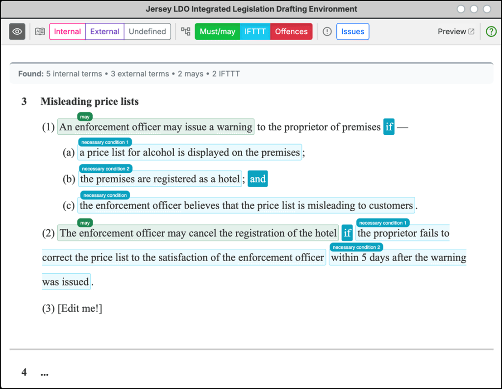 As one practical aspect of incorporating the perspective of legislative drafters, we have been looking into the possibility of an Integrated Development Environment-like tool for legislative drafters,[1] on which we will now be working with the Centre for Digital Law, at Singapore Management University, till June 2025. We have an interactive mock-up of some of the functions of such a tool for legislative drafters, which includes two examples of “may” powers. The idea is that legislative drafters should find it easy to mark up types of provision, including “may” provisions, while they are drafting in such a way that a computer can then follow the logical structure that has been created.