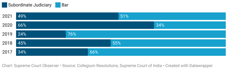 Recent research indicates that benches of the High Court are dominated by judges who have been directly elevated from the bar (‘Lawyer Judges’) while judges elevated from the lower judiciary (‘Elevated Judges’) constitute a smaller share. Furthermore, the bench of the Apex Court is adorned almost exclusively by judges from the High Court cadre, thus effectively carrying an even smaller share of Elevated Judges from the lower judiciary to the Supreme Court. Thus, if there is to be any reform in the system, it must be targeted at the High Court level. The graph below compares the number of Lawyers Judges and Elevated Judges as recommended by the Supreme Court Collegium for elevation to the High Courts.